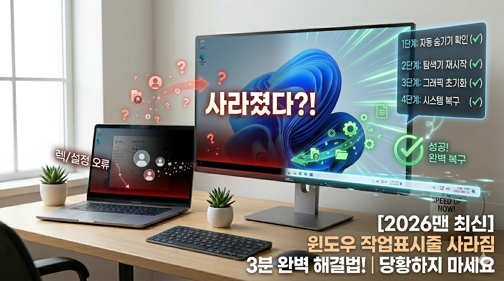 - 원인: 윈도우 탐색기(explorer.exe) 일시적 오류, 자동 숨기기 설정 켜짐, 듀얼 모니터 해상도 충돌 등.