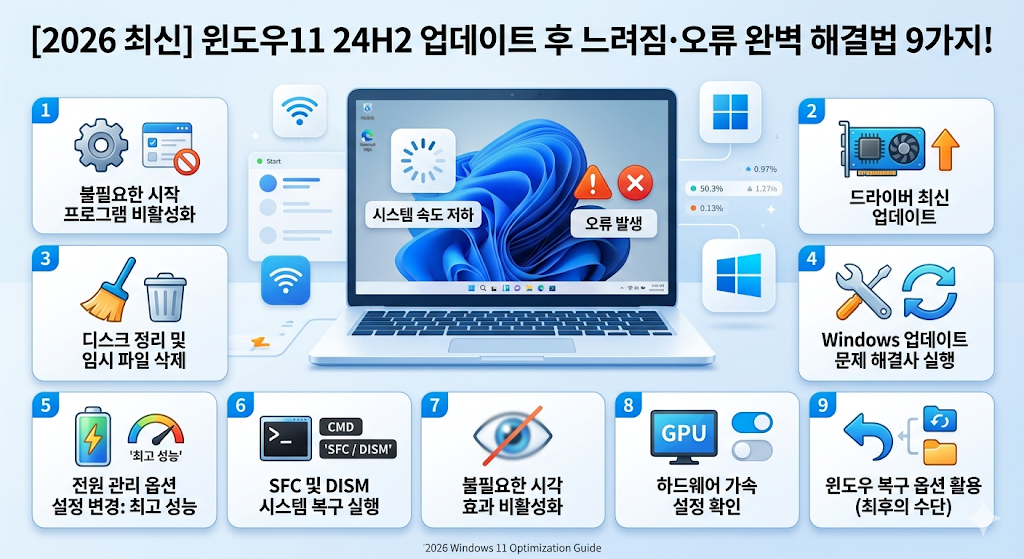 지금까지 2026년 기준 최신 윈도우11 24H2 업데이트 후 겪을 수 있는 주요 문제점 9가지와 구체적인 해결 꿀팁을 알아보았습니다.